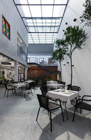 With elegance and charm with its sleek, modern facade accentuated by traditional design elements. The exterior features a warm wood-toned structure complemented by turquoise accents and large, arched windows that allow a glimpse into its stylish interior.