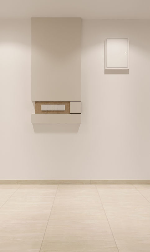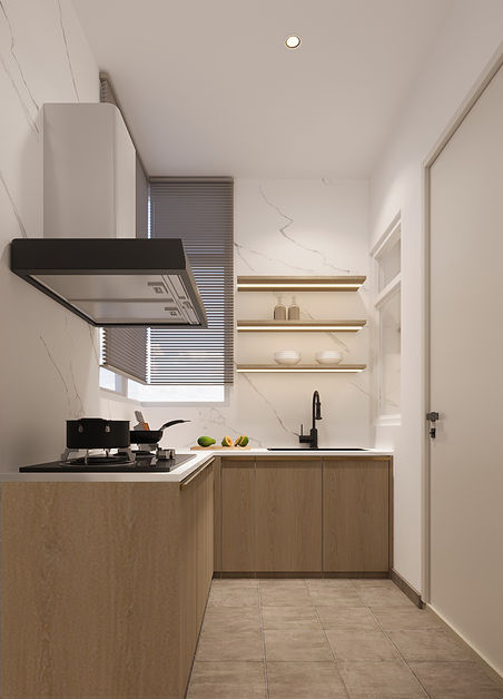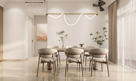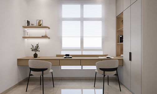 Embraces a modern minimalist aesthetic with clean lines, neutral tones, and natural textures, creating a calm and inviting atmosphere. Light wood finishes add warmth and contrast beautifully with the soft beige and white palette. The bedroom features a sleek built-in wardrobe, layered bedding in muted tones, and touches of greenery for a tranquil feel. In the living area, a plush sofa with textured pillows, organic-shaped tables, and sheer curtains enhance comfort and brightness. Strategic lighting highlights the clean architecture while adding understated elegance.