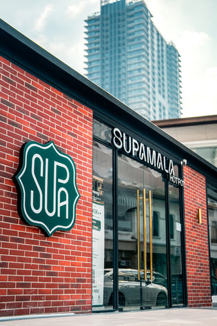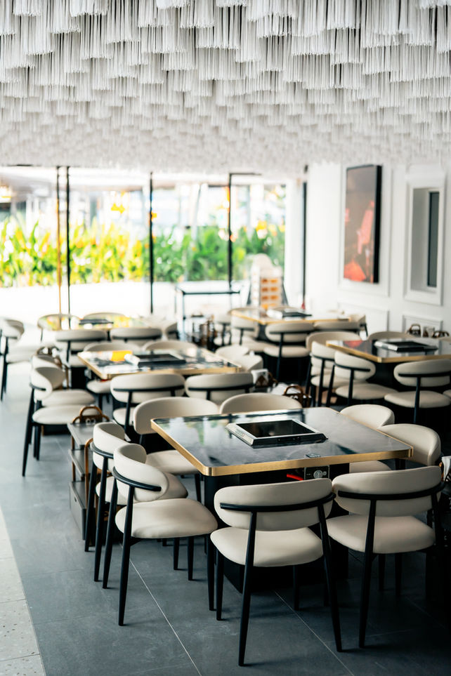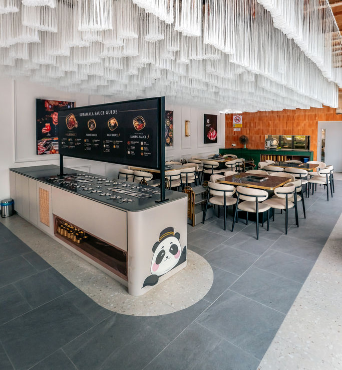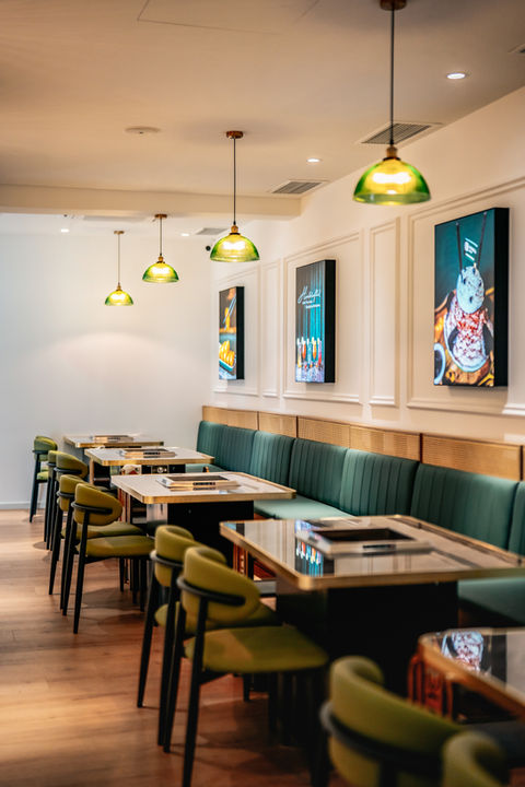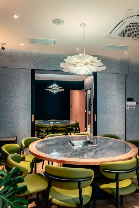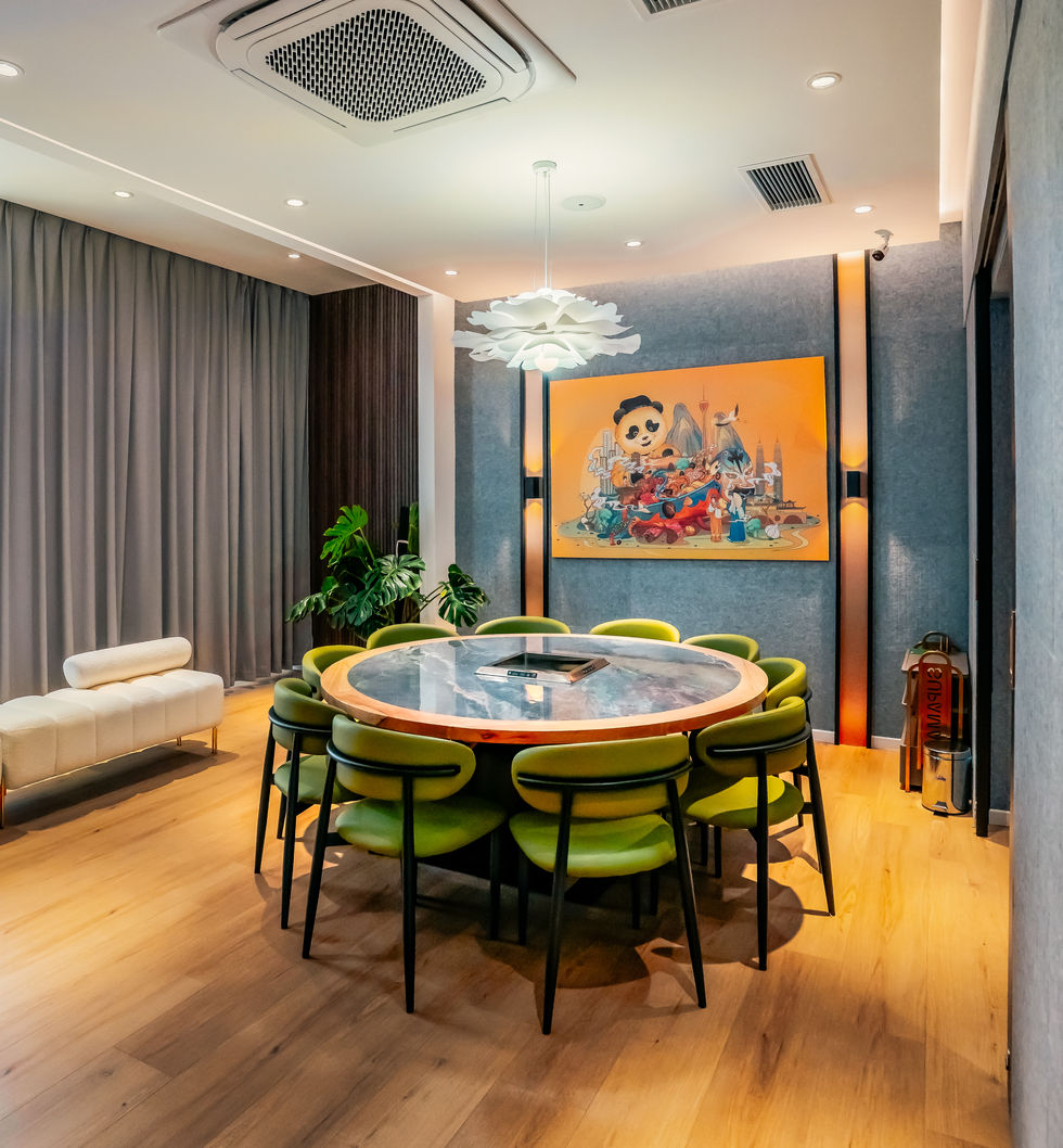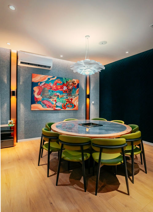 With the combines modern sophistication with warm, earthy tones, featuring a marble table, green upholstered chairs, textured walls, bold abstract art, and modern amenities, creating an inviting and luxurious ambiance for a halal hotpot mala experience.